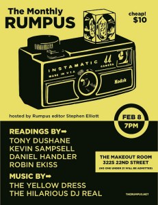 The previous night in San Francisco was also one to remember, with Stephen Elliott hosting a great line-up for his Rumpus reading at the Makeout Room. I got to read with Daniel Handler but for some reason never had a chance to actually meet him. Drats! He read a really part from a book-in-progress, hilariously titled “Why We Broke Up.”