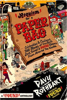 A couple of years ago I was excited to have a short story in the Found-inspired anthology, Requiem For a Paper Bag (Simon & Schuster). It was a different sort of Found book–instead of photos of actual found artifacts, the book includes stories and essays about found stuff. It included a ton of cool writers and celebrities including Susan Orlean, Jim Carroll, Seth Rogan, Miranda July, Aimee Bender, Sarah Vowell, Andy Samberg, and a bunch of others. My story is one of the strangest things I’ve ever written and I was honored that Davy included it. I thought I’d use this occasion to post it on my blog. So, here it is–now on your Internets for the first time!!