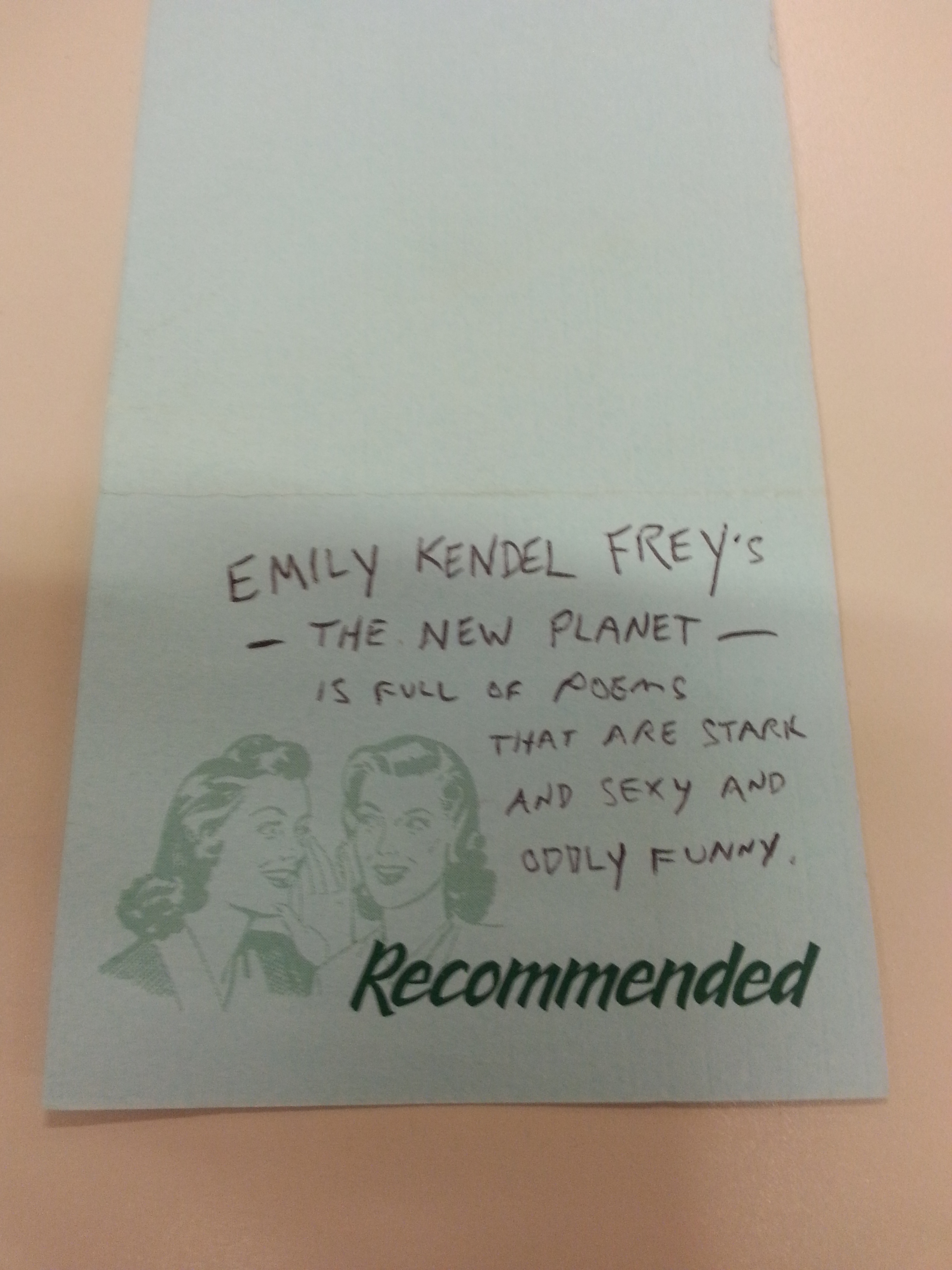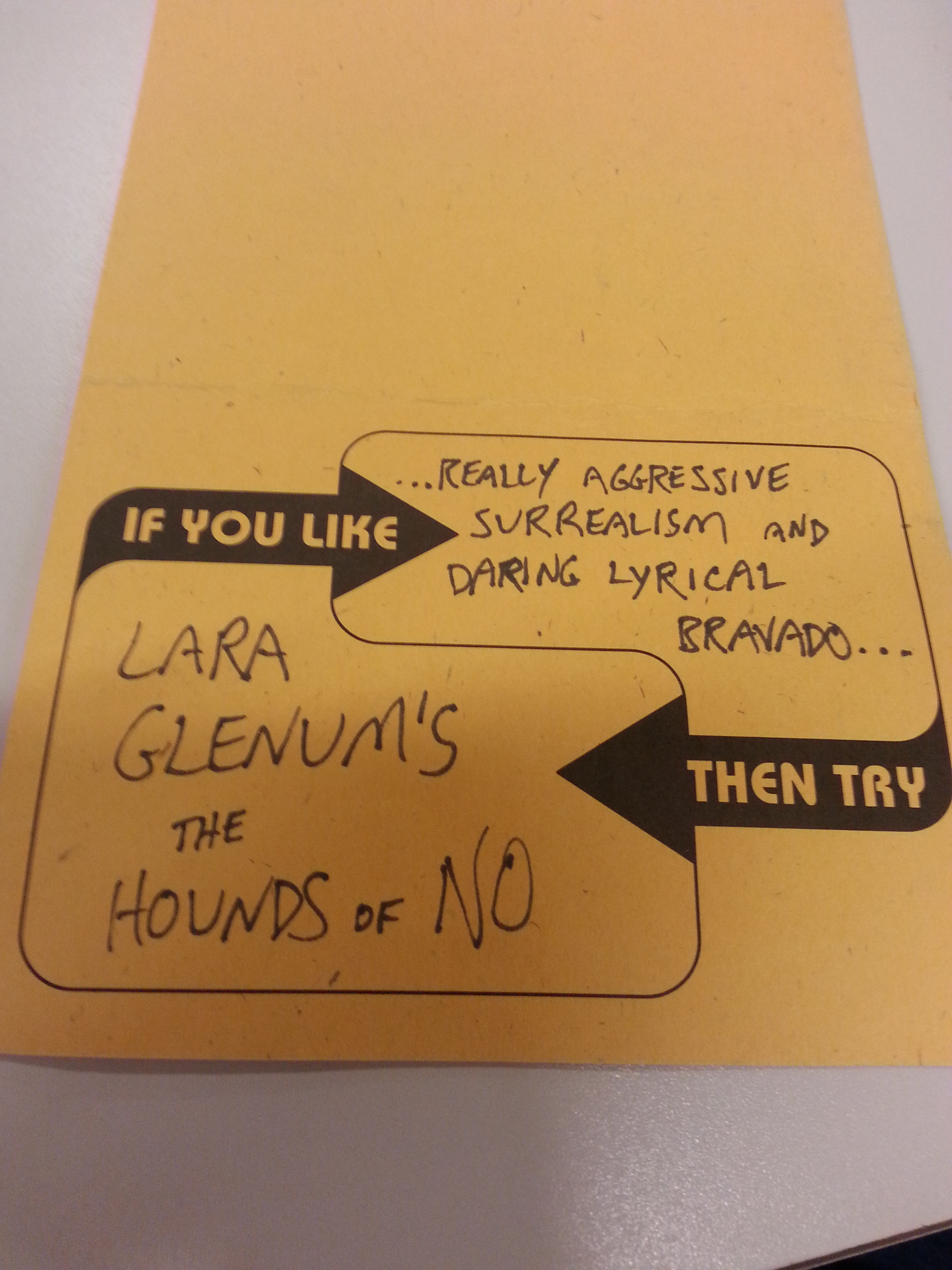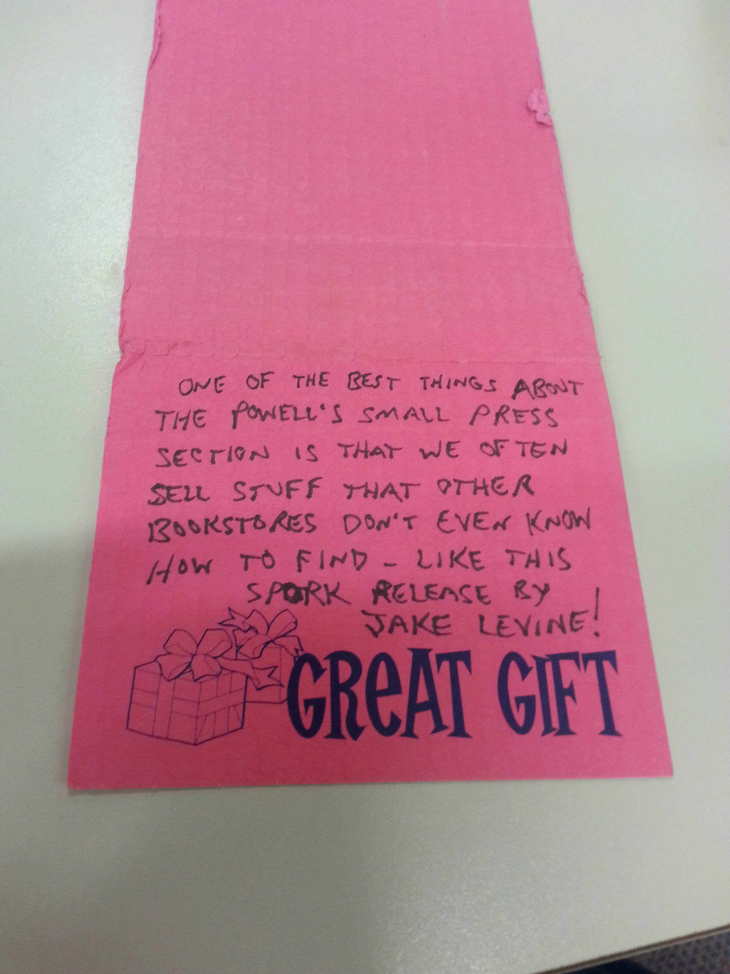 Last year, at work, we introduced a whole line of new shelf talker designs to freshen up the look of the store. That’s cool and everything, but (like a bibliophile hoarder) I am a little sad about throwing away some of my old stand-bys. I love making shelf talkers for my small press section. I think it has really helped a lot of readers discover new talent through the past fourteen years I’ve been in charge of it.
